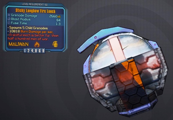 E mais um drop lendário do the warrior, uma granada, podendo ser tanto elétrica como de fogo,(até onde eu sei), da maliwan, chamada Sticky Longbow Leech,:
