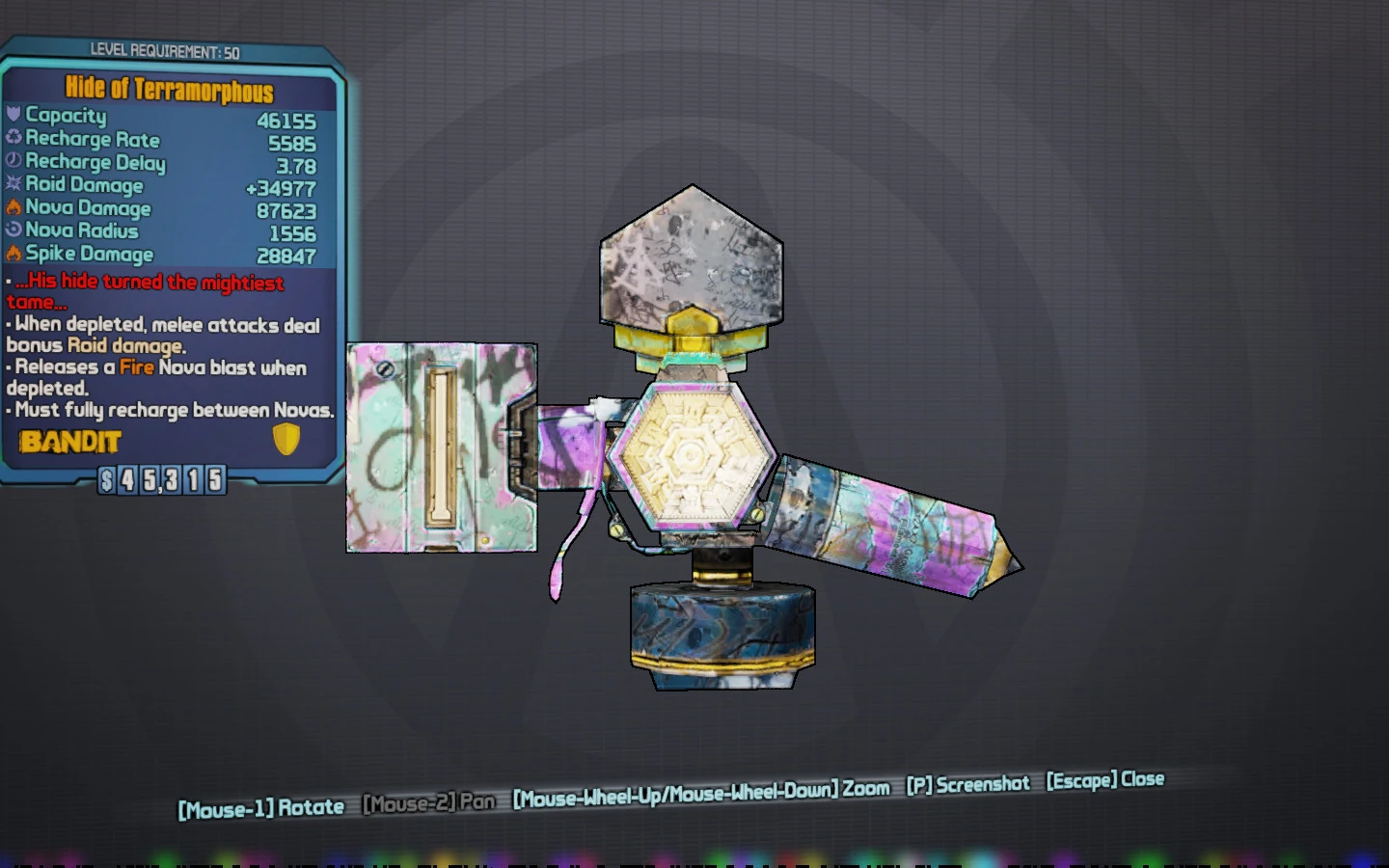 E, após completar o jogo vá até a Tannis em Sanctuary e pegue a missão You Will Die(seriously), no nível 50, de preferência e vá matar o boss terramorphous, ele é um raid boss, então recomendo chamar um ou mais amigos. Ele irá dropar a class mod slayer of terramorphous(atributos dependem de sua classe, então vou mostrar da que eu uso) e ele pode dropar um escudo e uma relíquia, o escudo é: Hide of terramorphous e a relíquia blood of terramorphous, então aí estão as imagens: