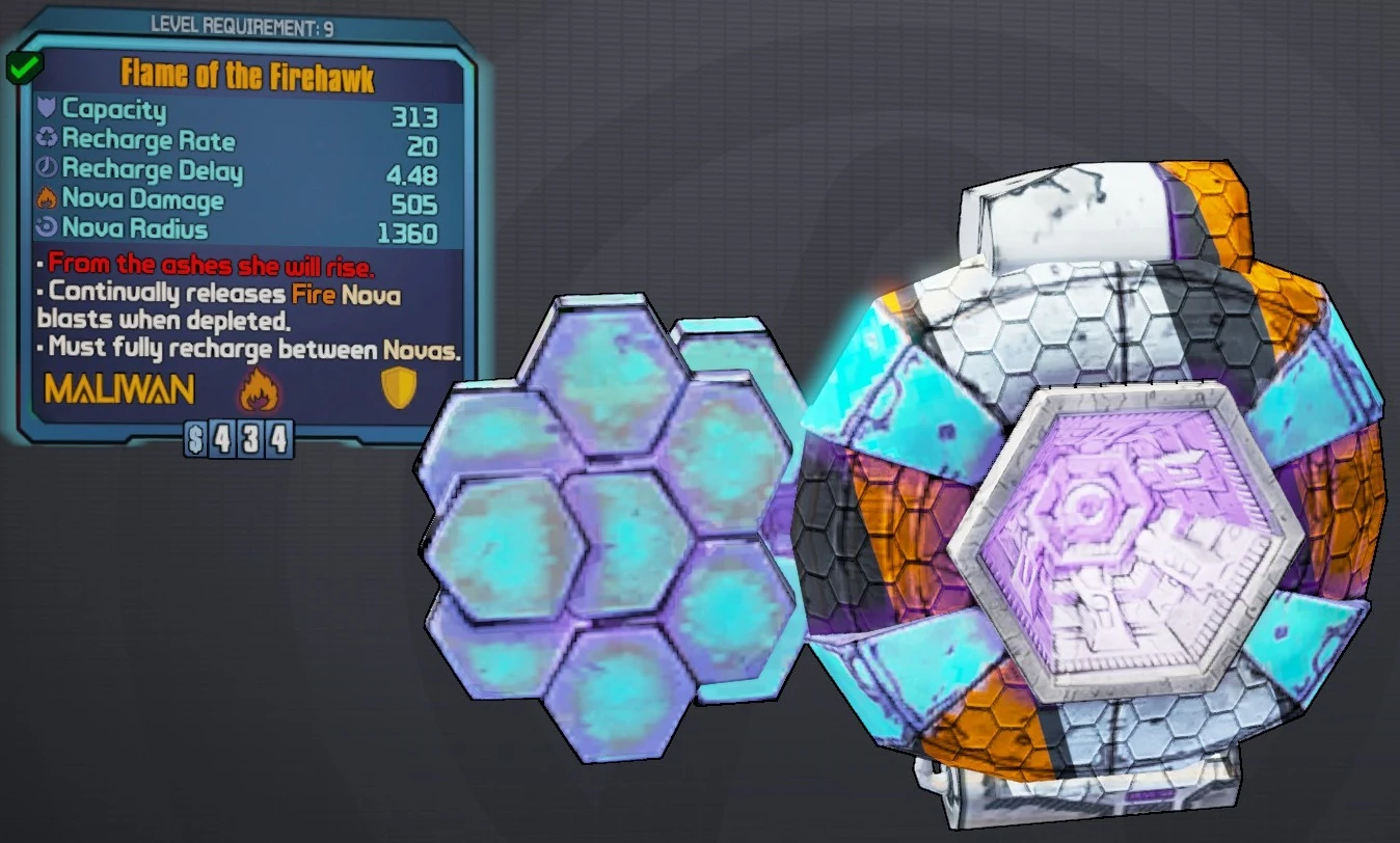 Outro deles, um escudo da Maliwan que é recebido ao completar a quest Cult Following: Enkinding, que é aberta após fazer as outras quests de Cult Following, a primeira é encontrada na cidade de Sanctuary, conversando com Lilith, a Firehawk, após completá-la você receberá um Nova Shield(O que solta uma onda elemental) de fogo, seu especial é, ela não dispara apenas uma nova burst, dispara continuamente enquanto está destruido.Seu nome é Flame of Firehawk, aqui a imagem: